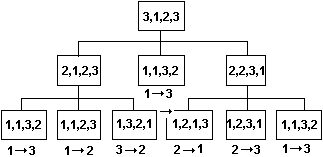 Последовательность вызовов процедуры tn при m=3 иллюстрируется древовидной структурой на рис.33. Каждый раз при вызове процедуры tn под параметры n, i, j, w выделяется память и запоминается место возврата. При возврате из процедуры tn память, выделенная под параметры n, i, j, w, освобождается и становится доступной память, выделенная под параметры n, i, j, w предыдущим вызовом, а управление передается в место возврата.